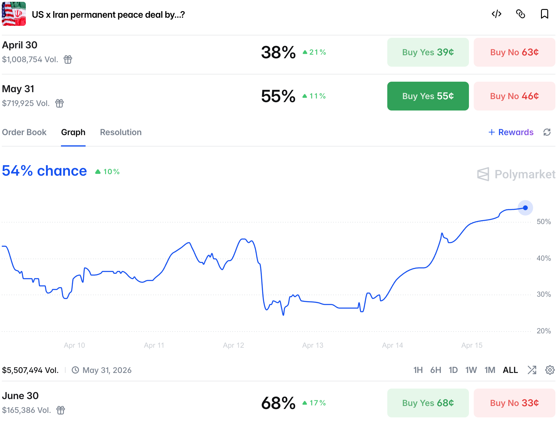 Chances for permanent peace went up significantly, reaching 54% by end of May.