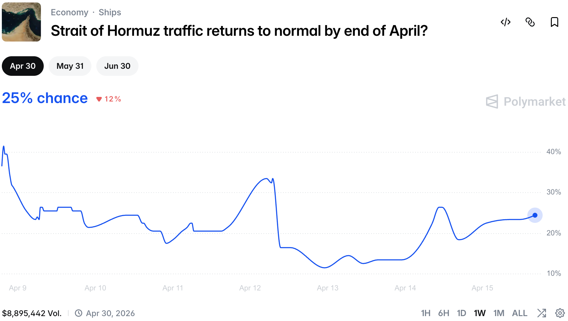 Similarly, chances of the ceasefire ending dumped hard as Trump found a cunning way to pressure Iran without going kinetic, ie. through a blockade: