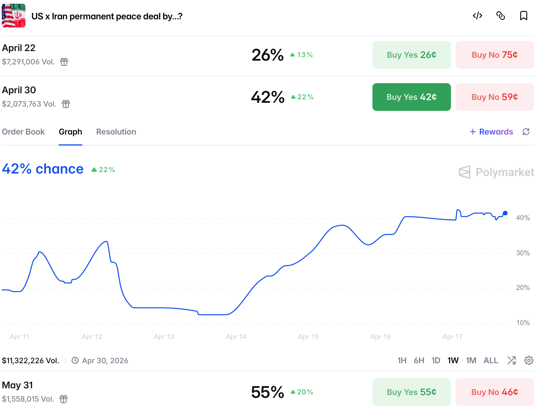 Chances for peace sustained around 40% by the end of the month, with a ceasefire deadline chances at 26% and a deal by end of May being more likely than not.