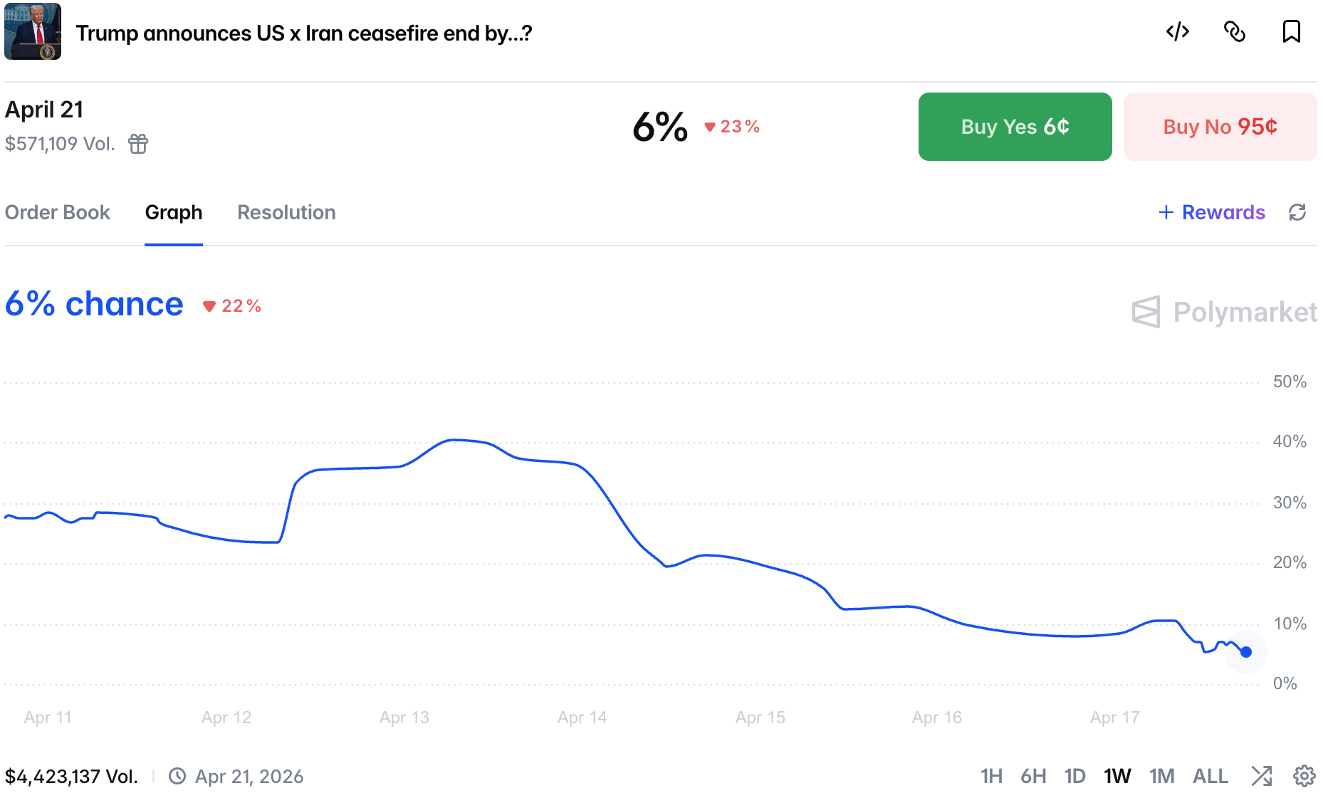Trump's announcement made waves, especially on the April 22 market, but we still lack an official confirmation that would send the markets up to bond territory. That being said, the sharps are mostly on the Yes side. At the same time the ceasefire lasting beyond initial deadline is now almost a certainty: