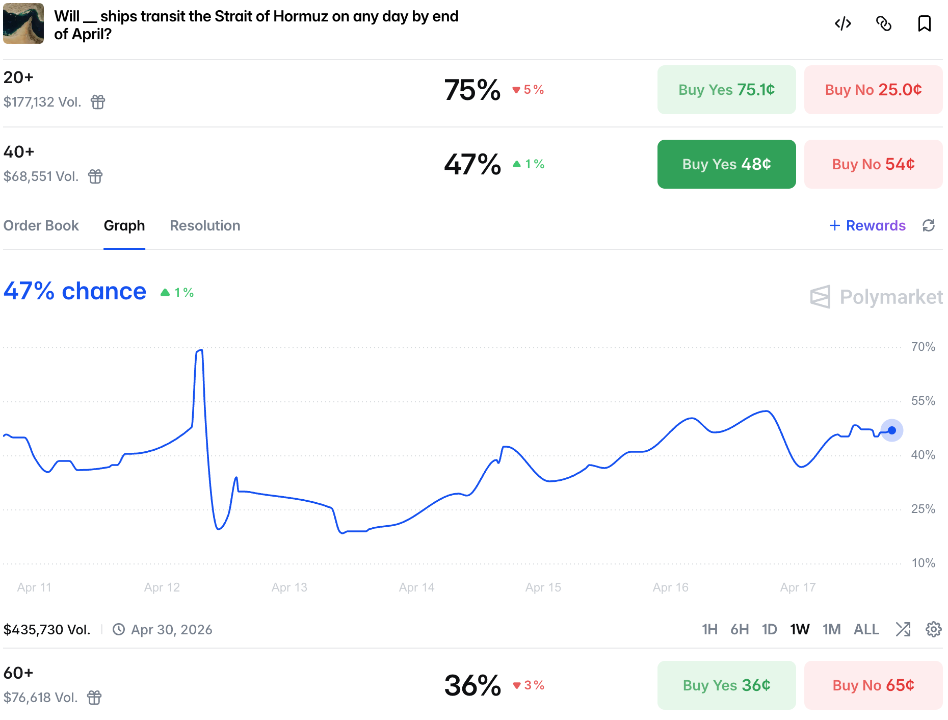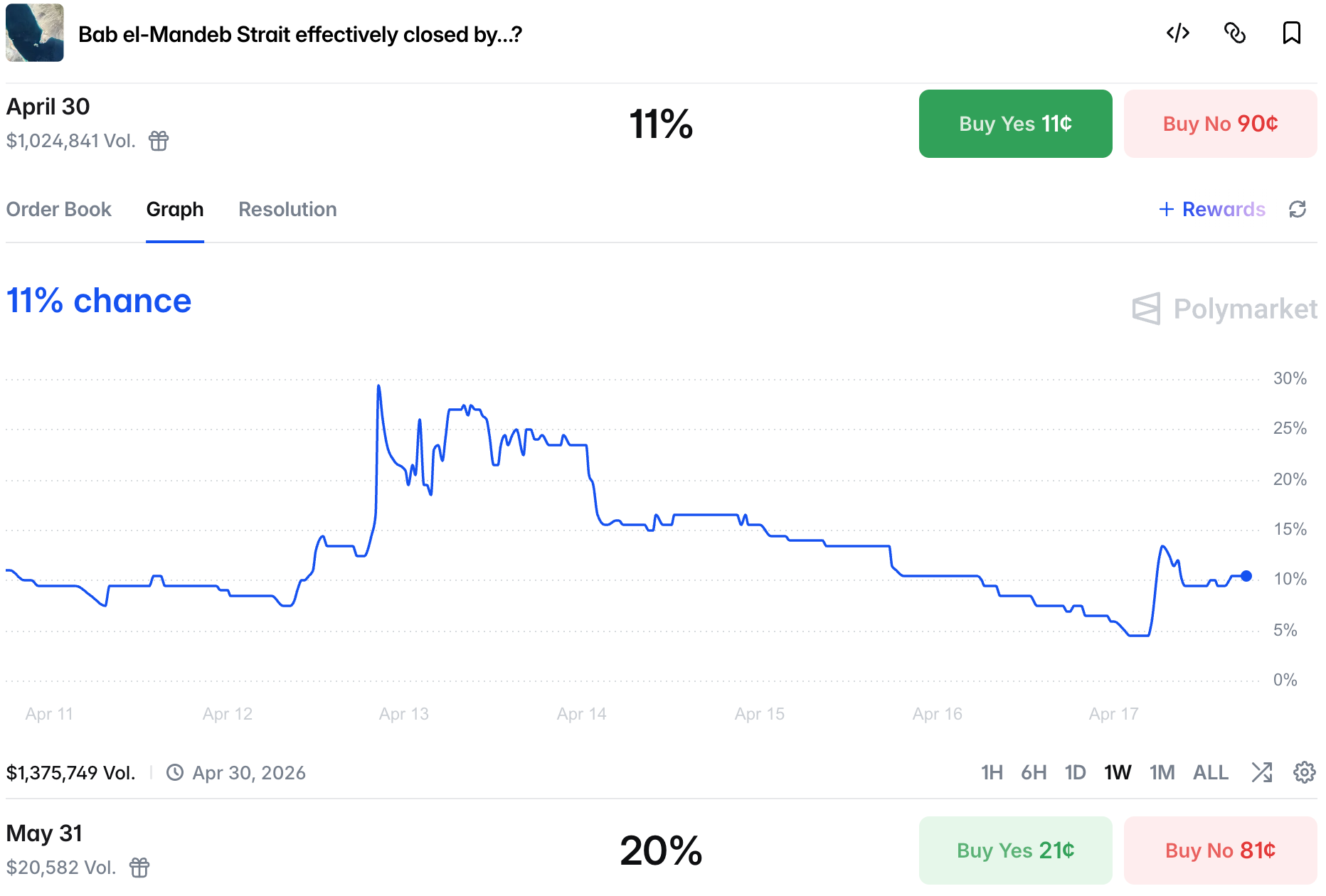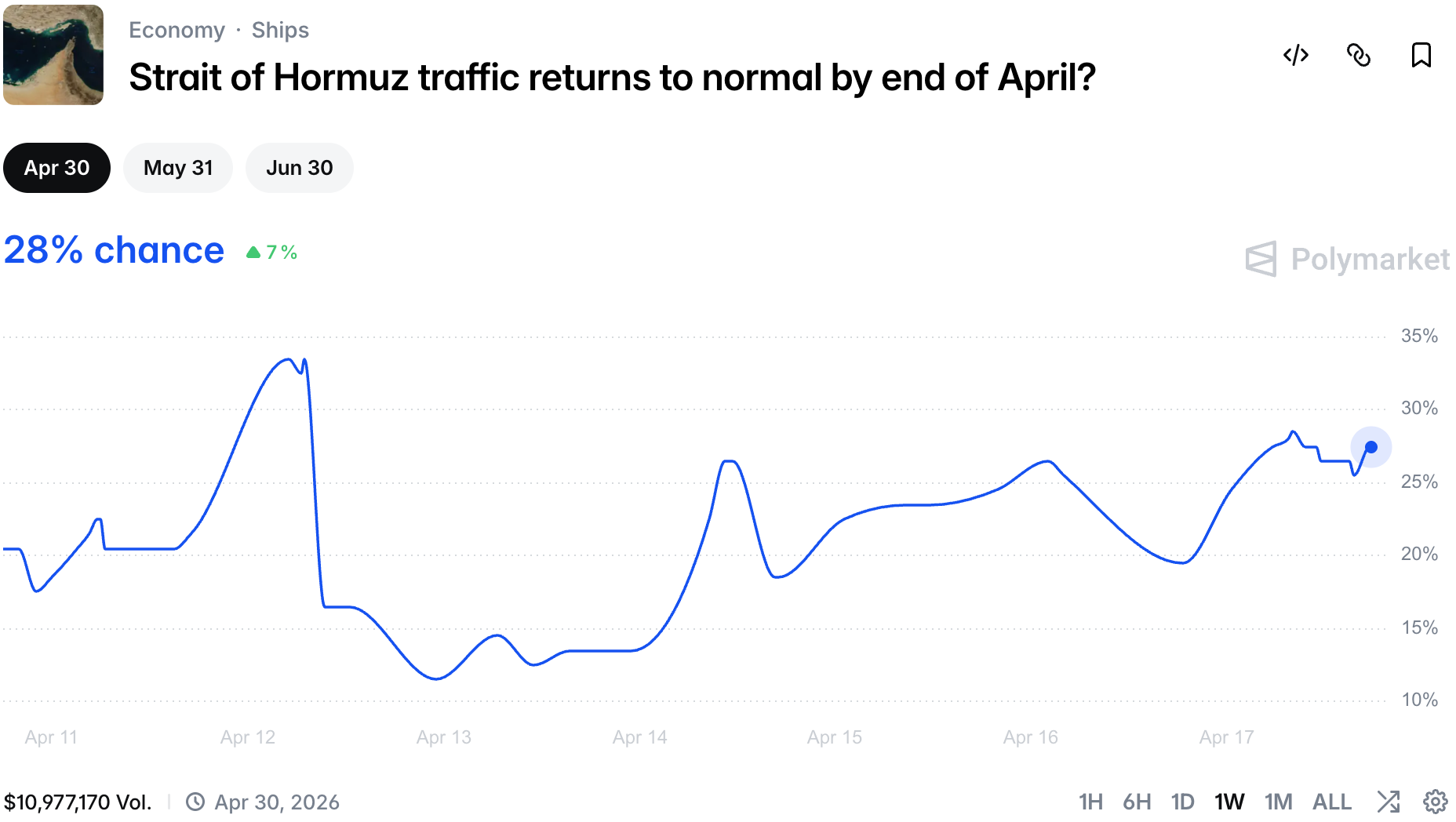 Even with general bullishness about a deal, the Strait of Hormuz is still closed by a double blockade and chances are low we will se a proper normalization of traffic by the end of the month.