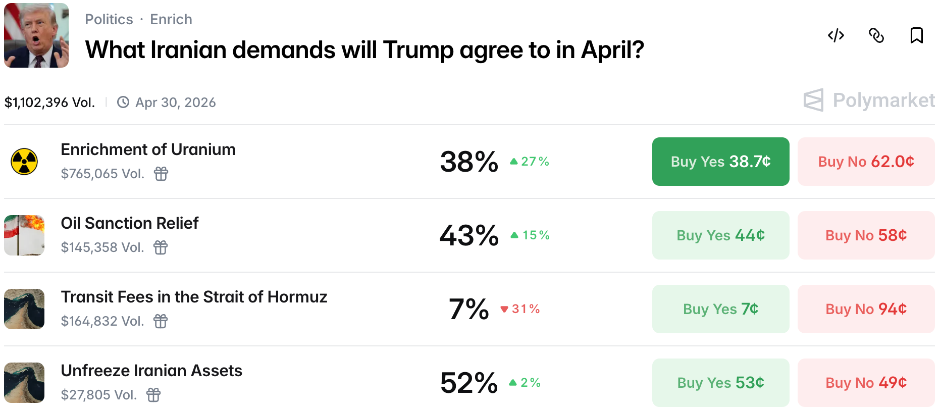 A lot depends on the shape of the deal which is for now unknown. That being said, Polymarket traders think sanctions relief and unfreezing of Iranian assets are likely, while a toll is dubious. When looking at chances, remember that there is a steep discount due to a deal in April having only 42% chances at this point - if you remove the discount all of the below are above 50% likely outside of the fee, which would be at ca. 17%: