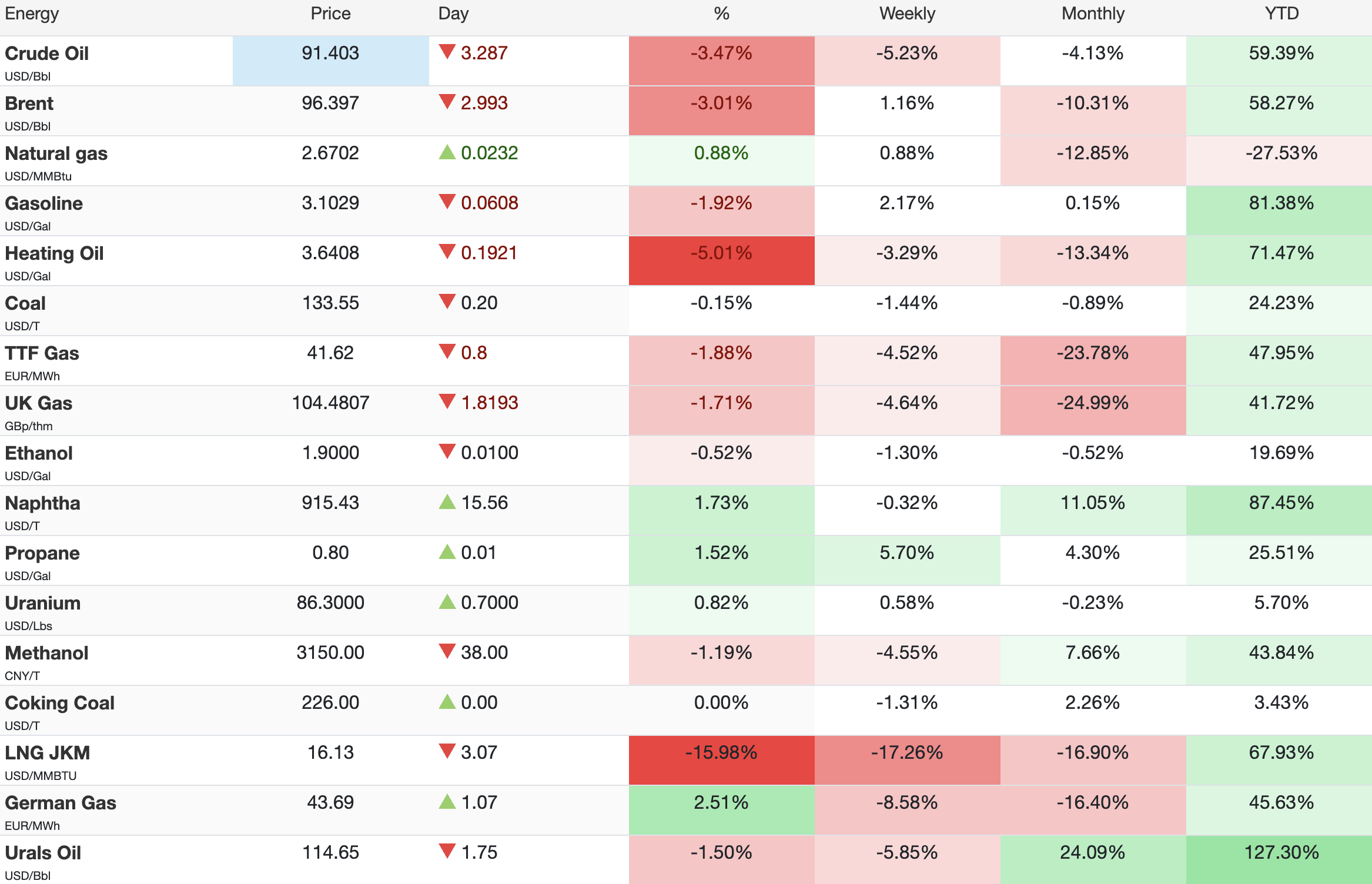 Energy prices are also cautiously bullish deal with red across the board as we go into the weekend: