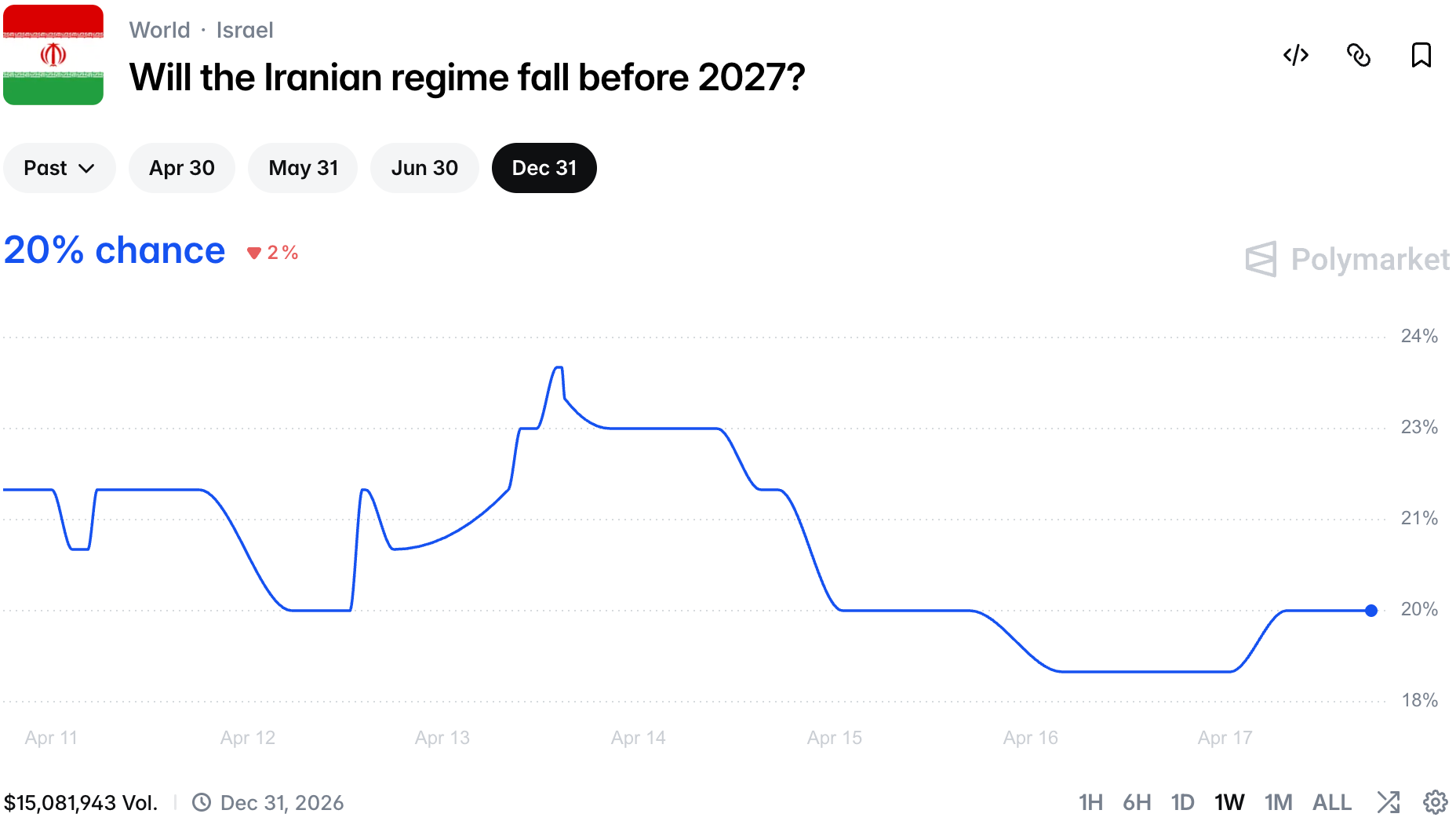 Iran regime fall chances are also flat since yesterday as there is no indication of any cracks in the regime.
