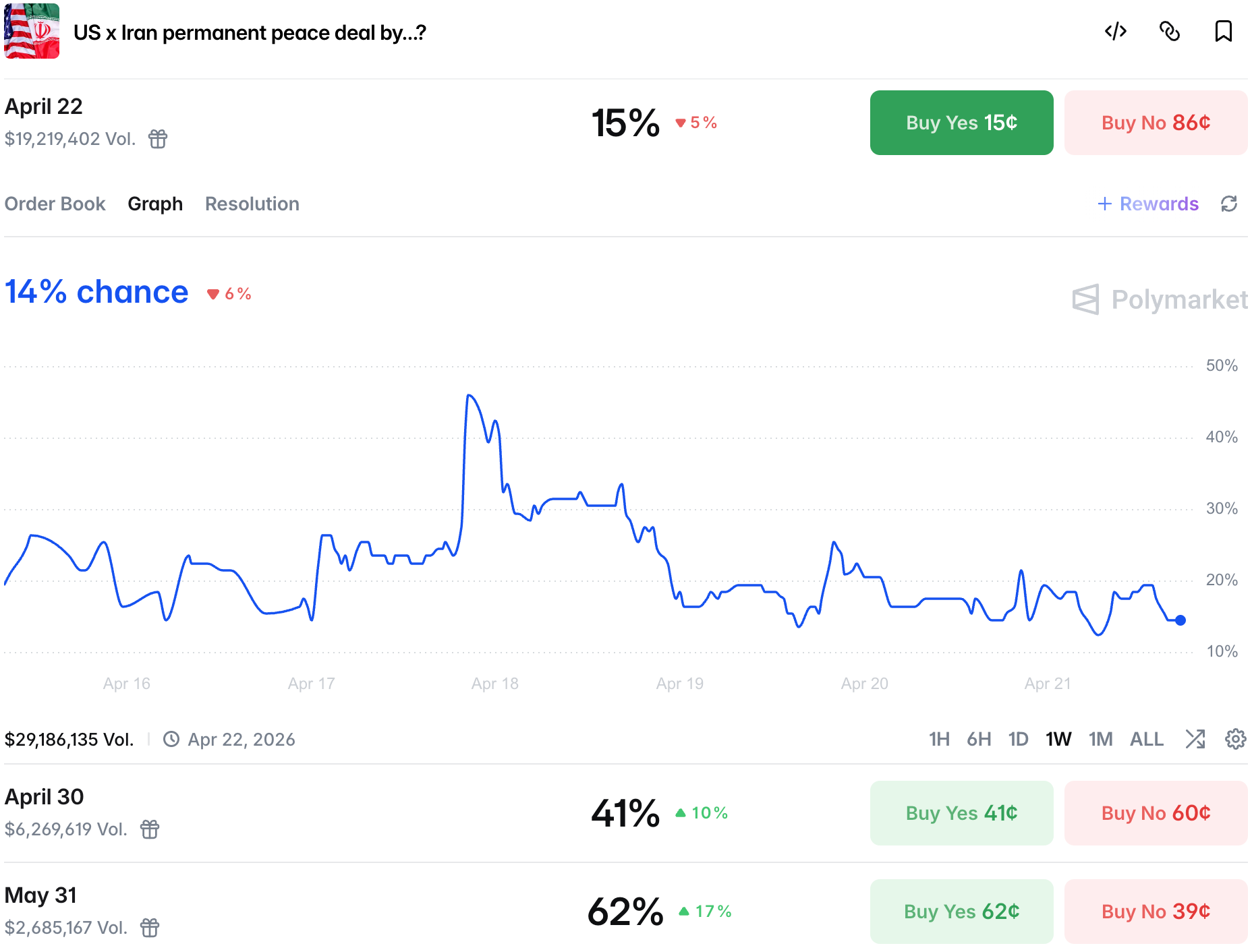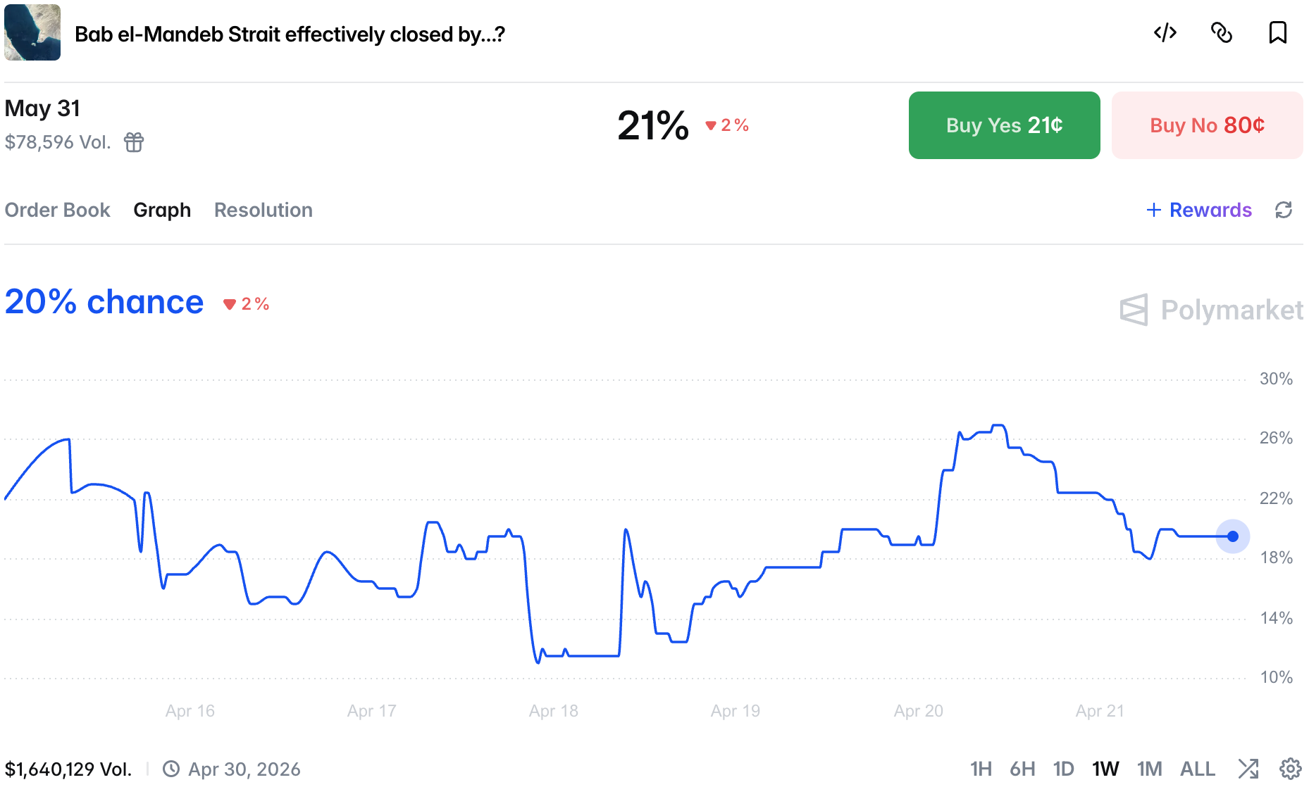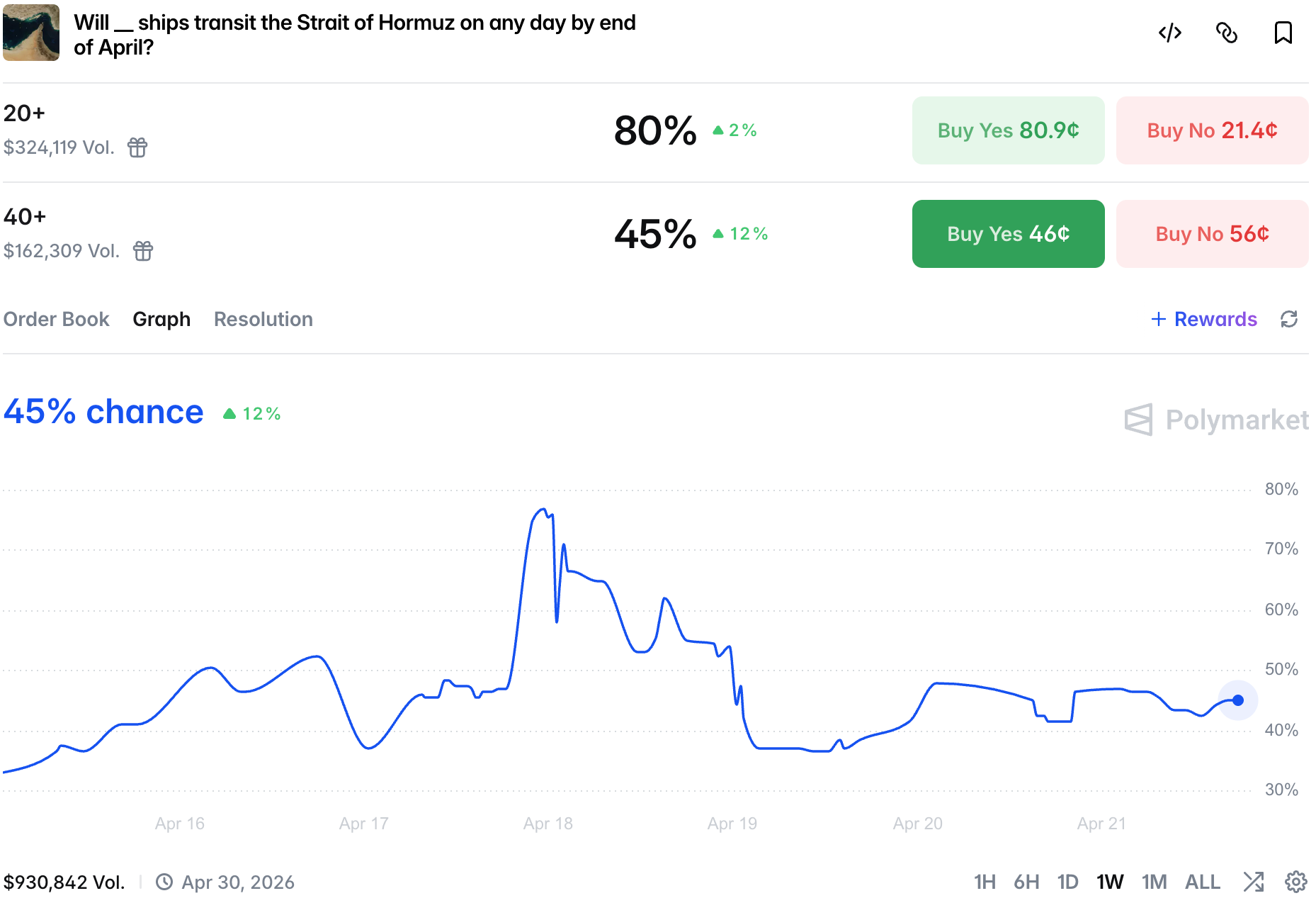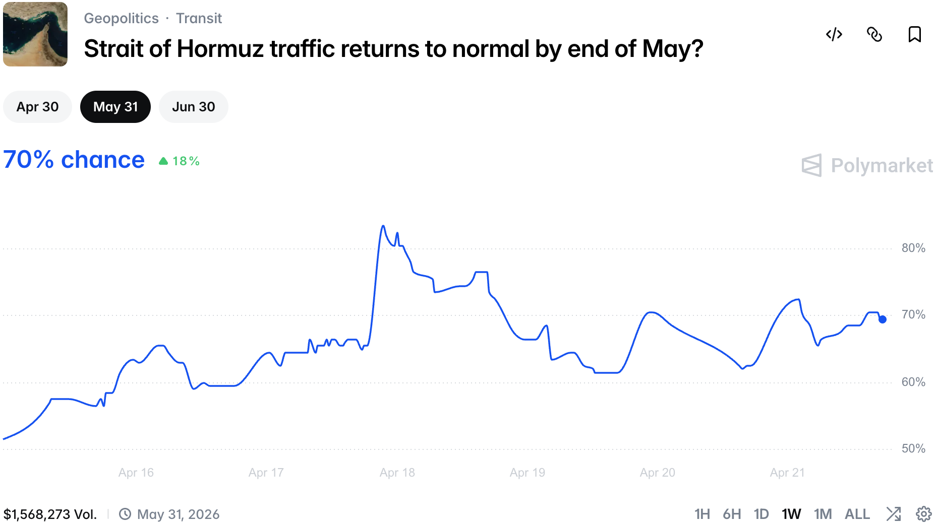 While end of April market on the Strait of Hormuz traffic normalization is tight, traders see as much as 70% chance of traffic normalization by end of May.