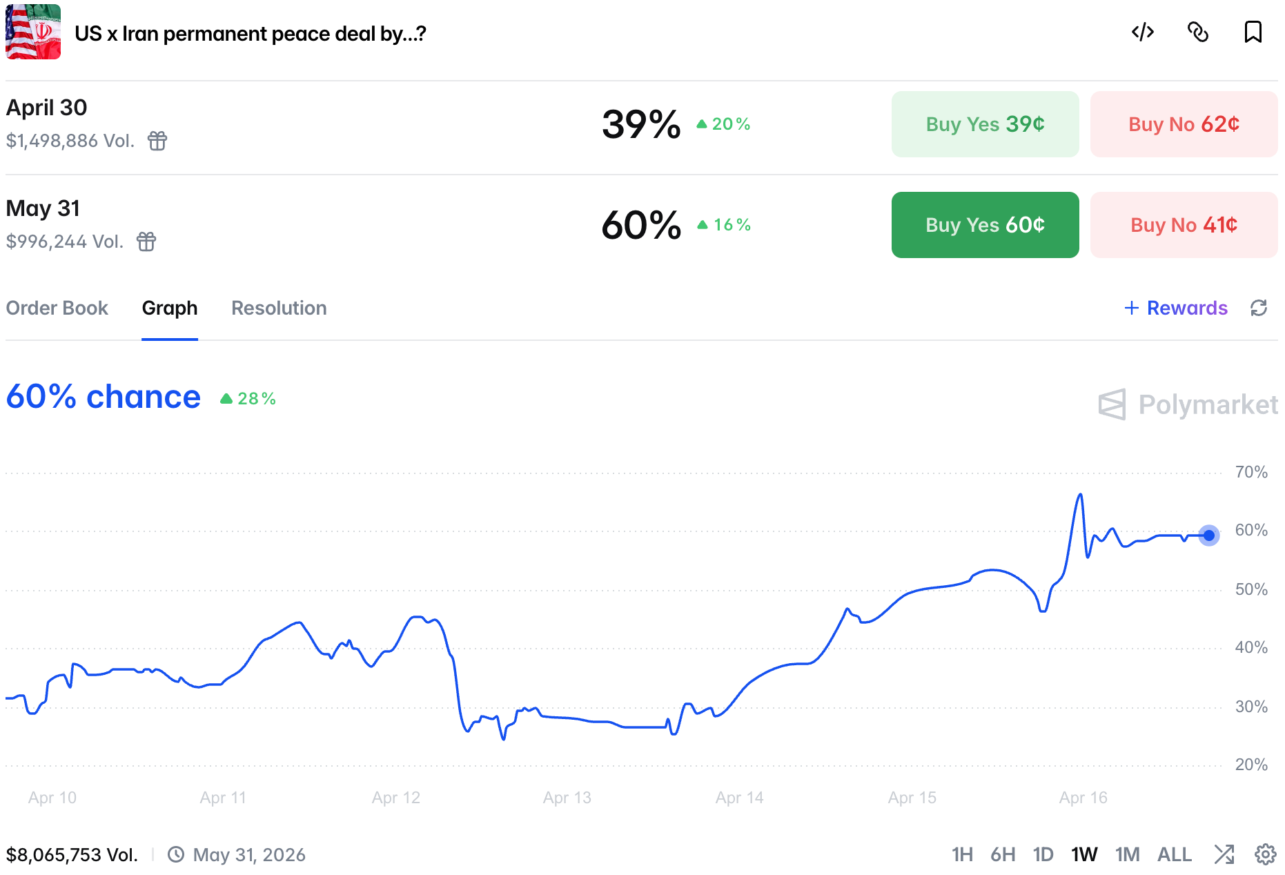 In a flurry of conflicting news traders see a path towards peace. Since yesterday, peace chances grew to 60% by end of May.