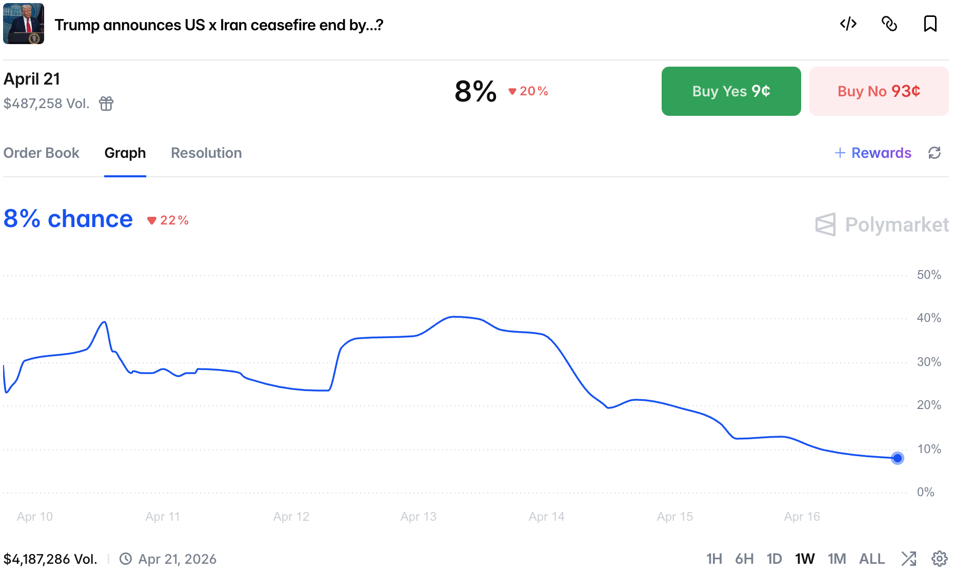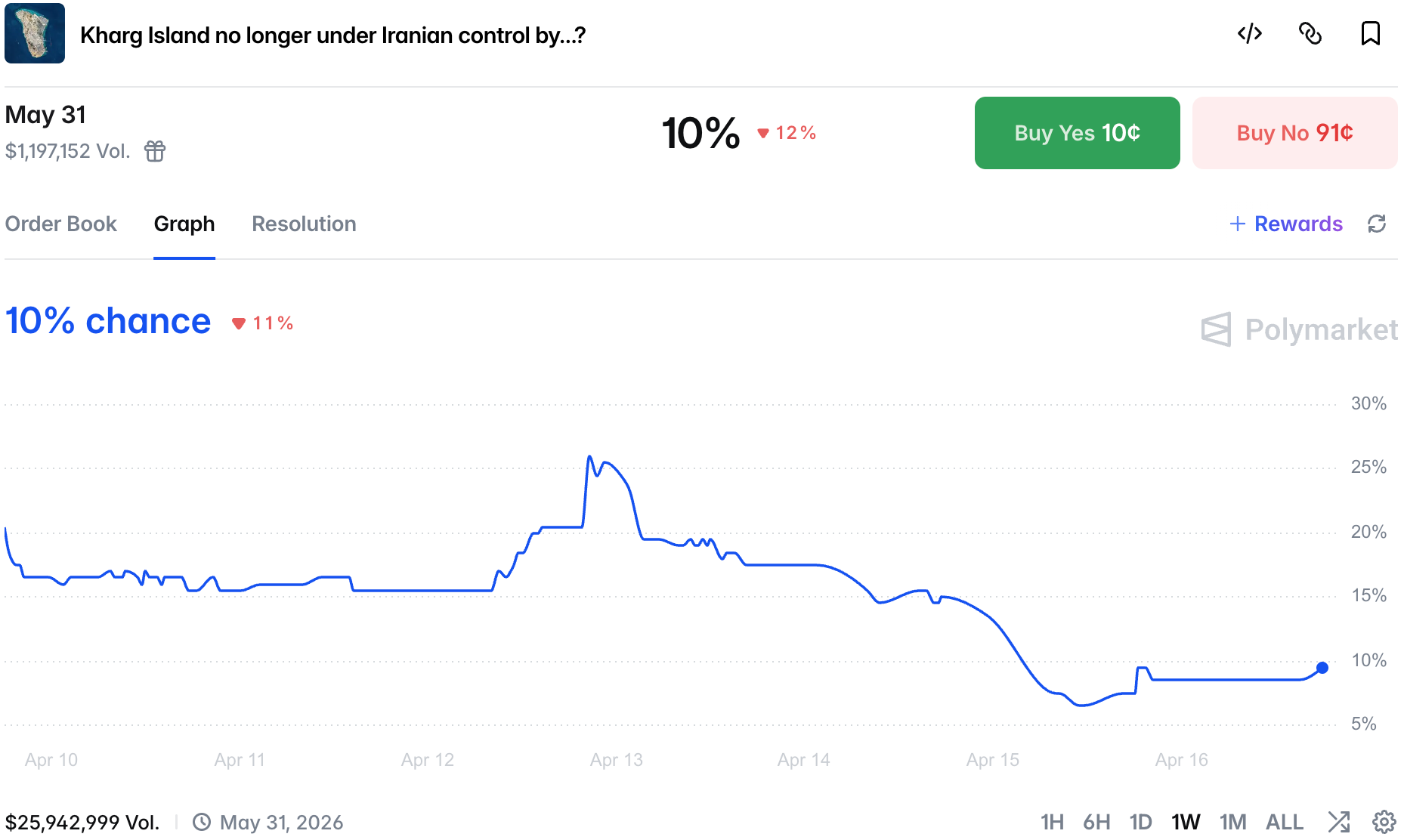 Be it pressure tactic, internal conflict or the ceasefire being just a disguise for renewed action, this is the one thing that keeps the situation ambiguous. And in case of invasion, we now cannot say what would be the target as Kharg Island chances dropped to only 10%: