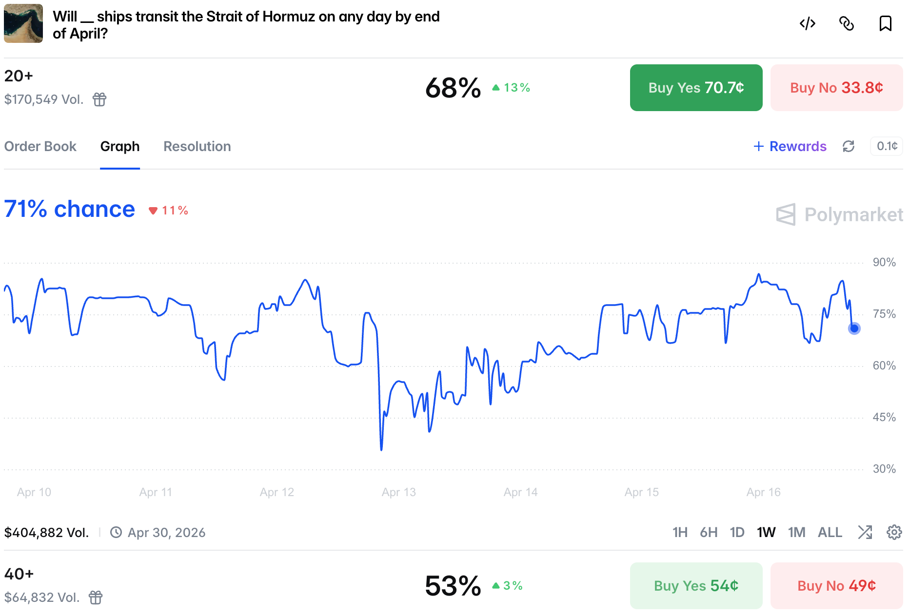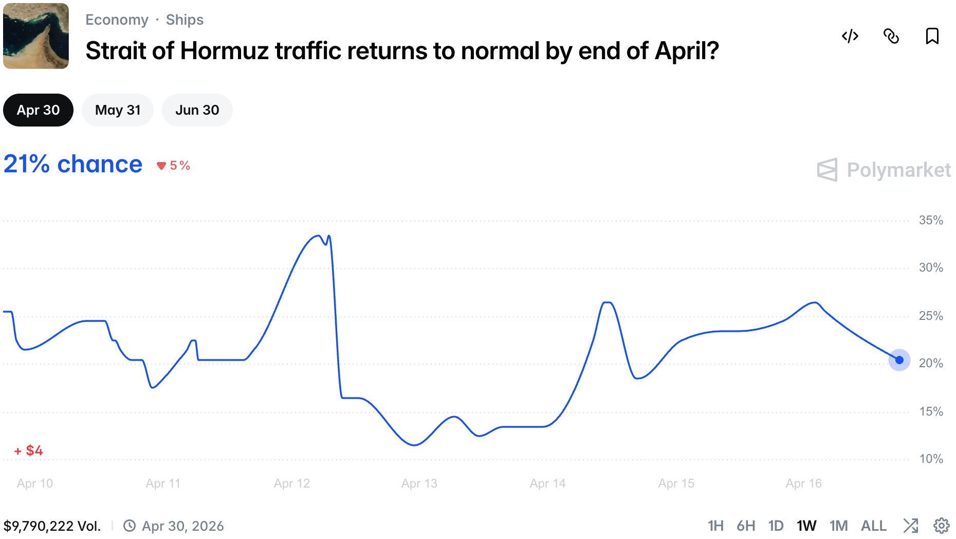 The Strait of Hormuz continues to be effectively closed. And here traders continue to be bearish on the normalization of traffic.
