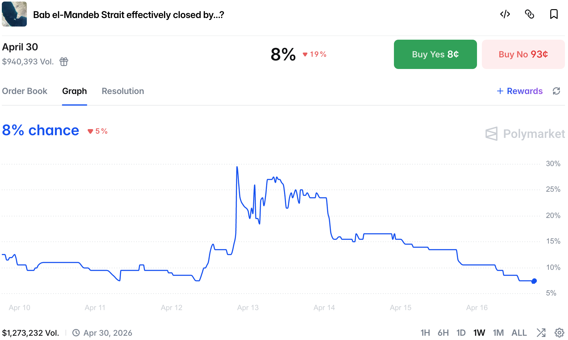 On the other side of the Arabian peninsula, chances of the Bab-el-Mandeb Strait closure also decreased, reaching previous lows: