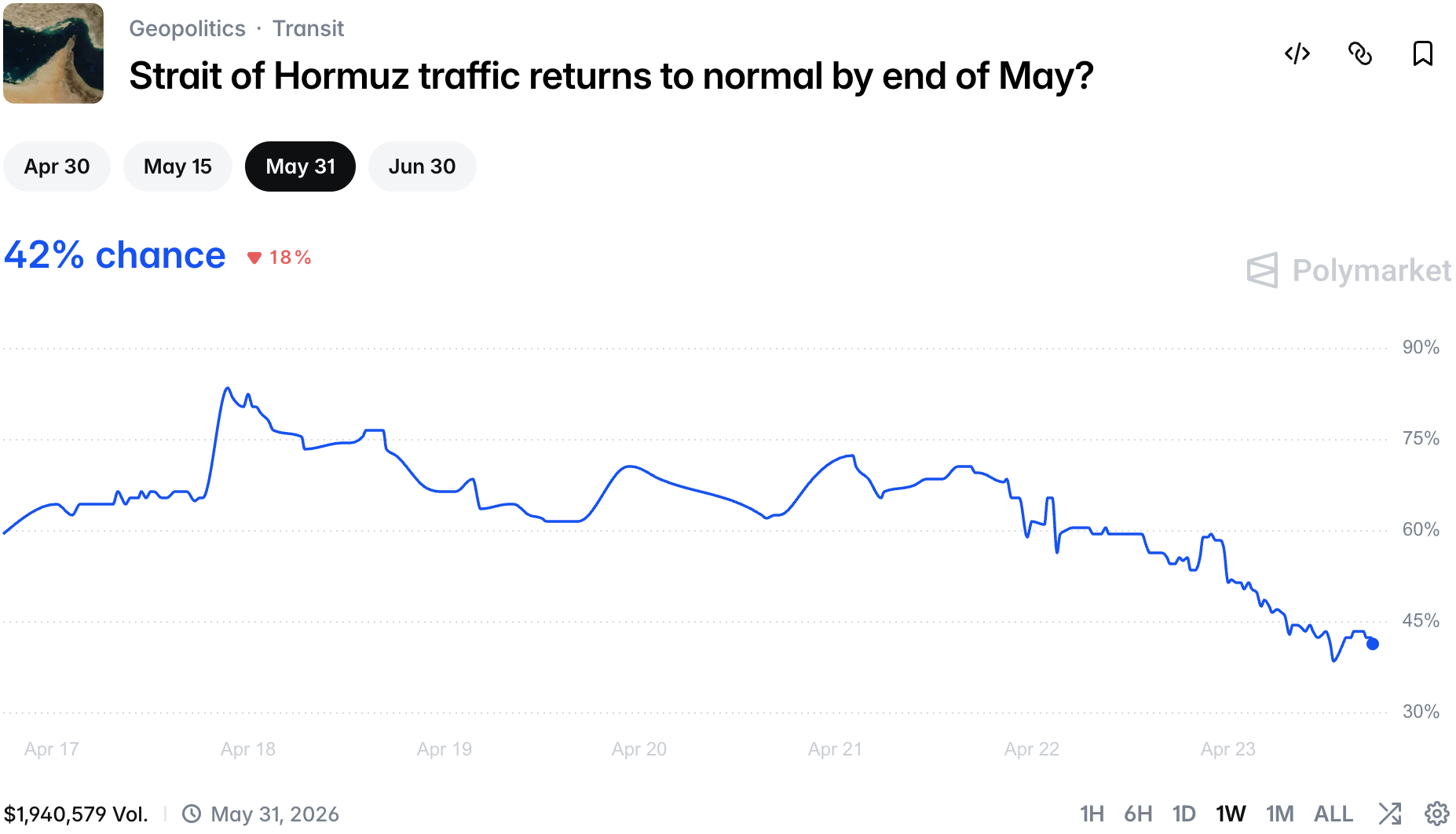 Traffic in the Strait of Hormuz is now projected to not normalize by the end of May.