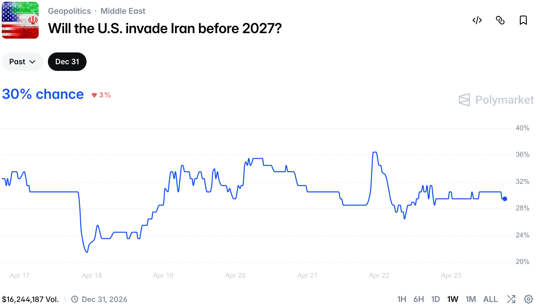 Despite talks stalling, US invasion chances remain flat at 30%.