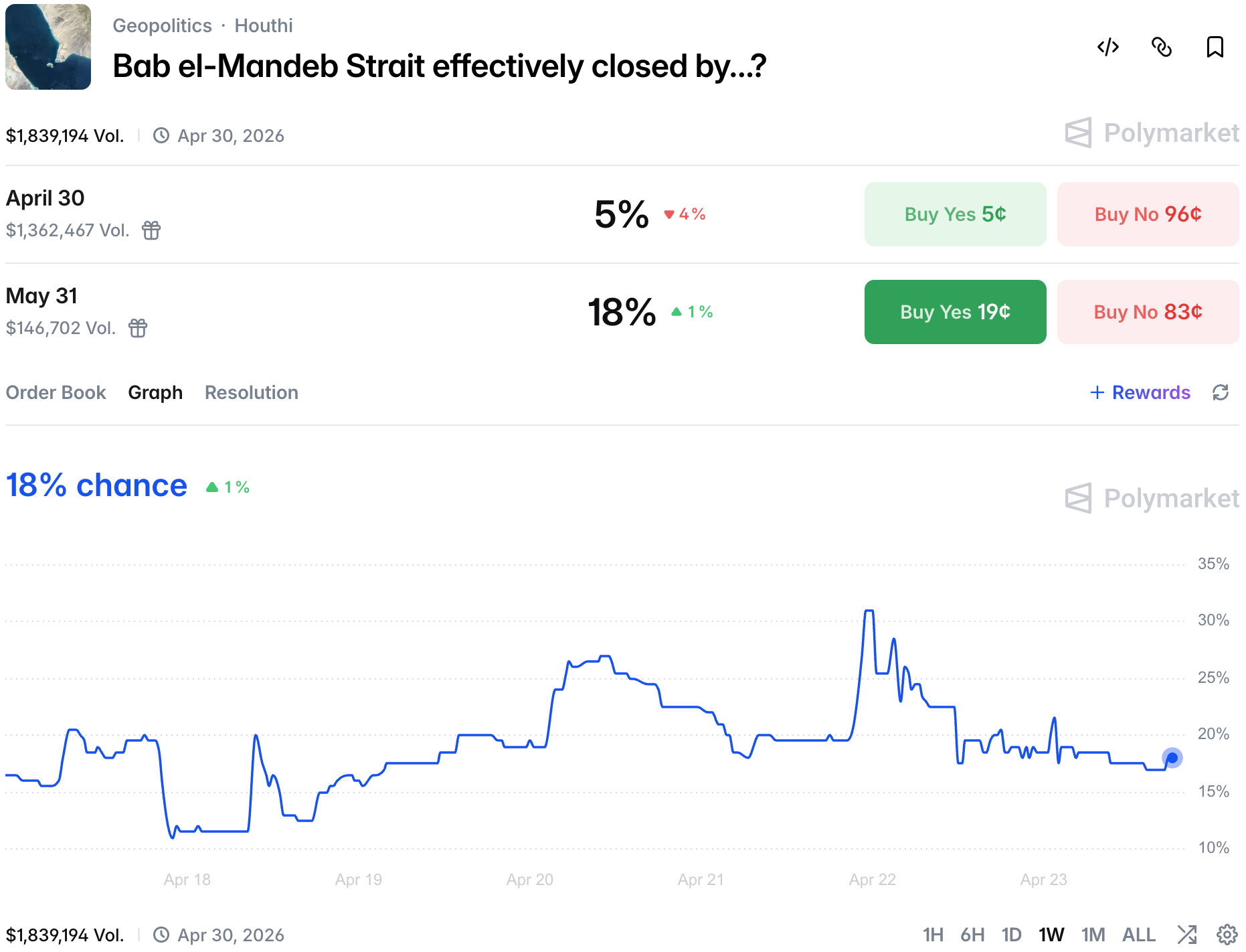 On the other side of the Arabian peninsula, the Bab-el-Mandeb Strait closure chances are mostly flat at 18% as even in case of the resumption of hostilities, there is no clear indication Houthis would jump in immediately: