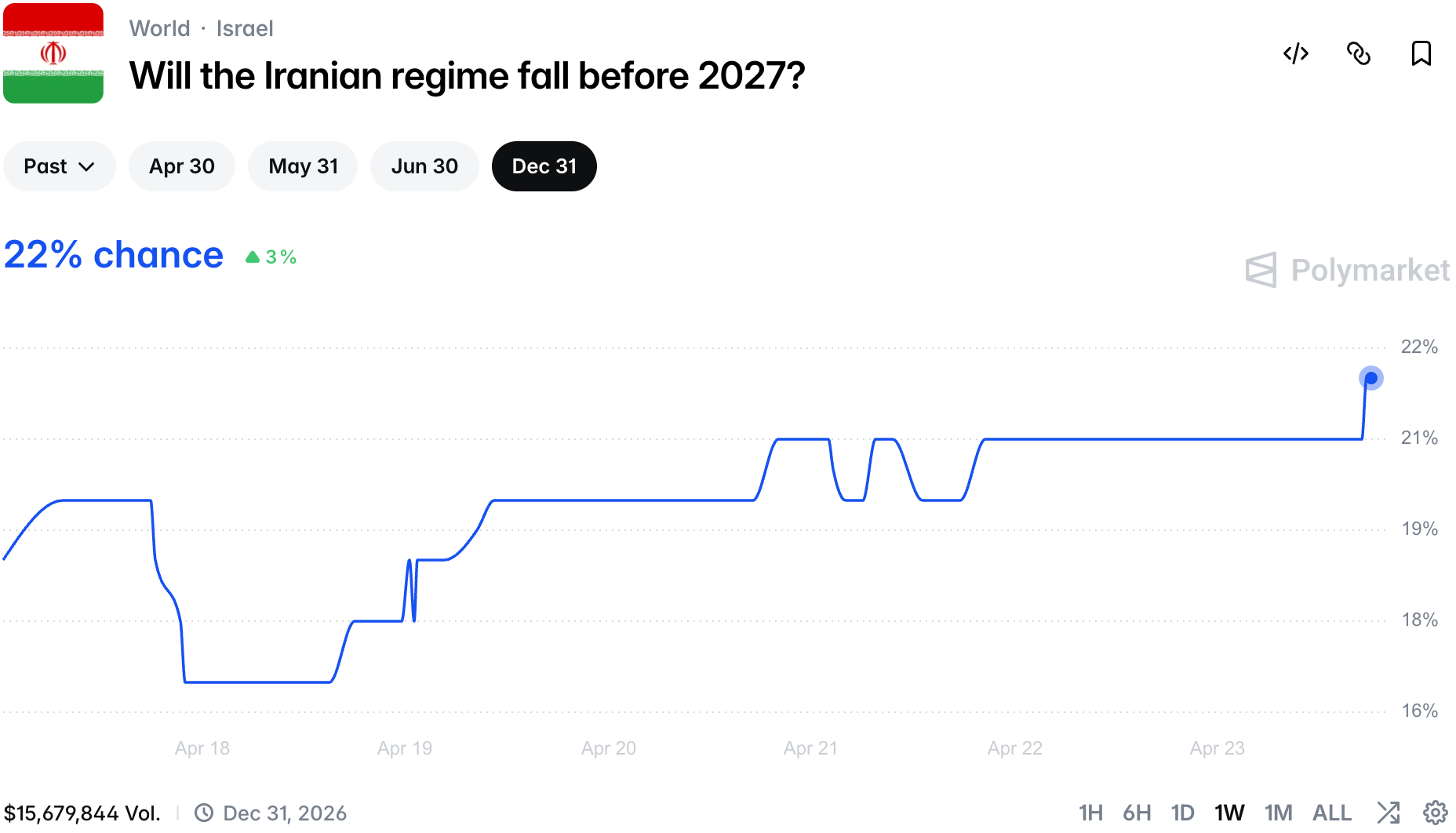 Despite an obvious rift inside the Iranian regime, the chances of its fall are mostly flat at 22%.