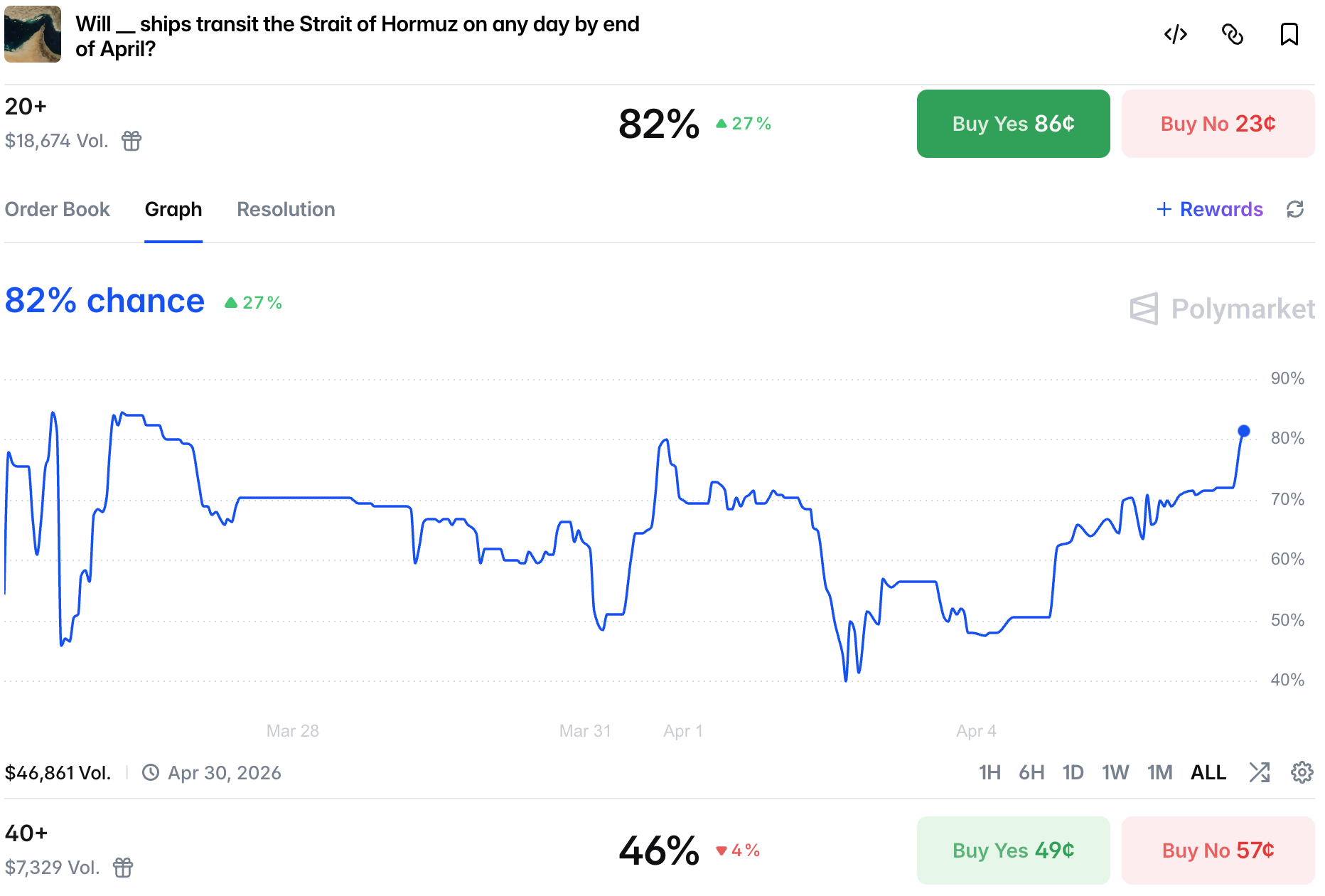 The Strait of Hormuz remains effectively closed, but as more and more countries approach Iran to cut a deal, chances of 20+ ships passing the strait in a signle day rose to 82%.