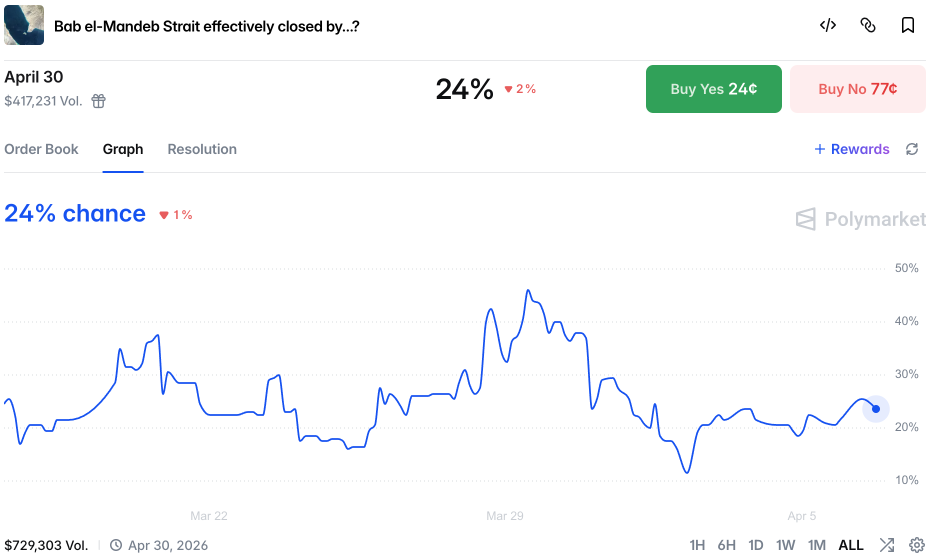 At the same time, chances of Bab-el-Mandeb strait closure remain low as the Houthi are not escalating at this point: