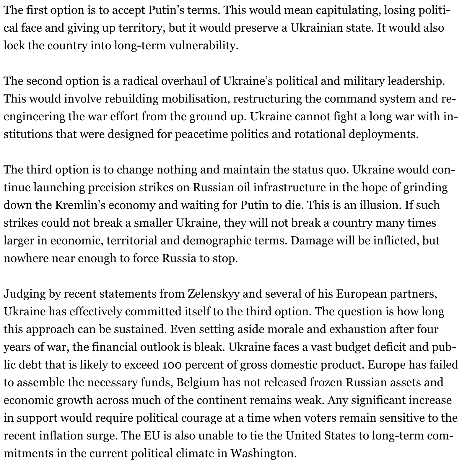 He is right - Europe has no balls to conduct the second option at the moment and will continue with the third for the foreseeable future. But the time will come again when Trump will once again have enough leverage to try peace. And then we shall see if they have what it takes and make Ukraine a proper military state it is inevitably going to be. That would also be the time to install Zaluzhny.
