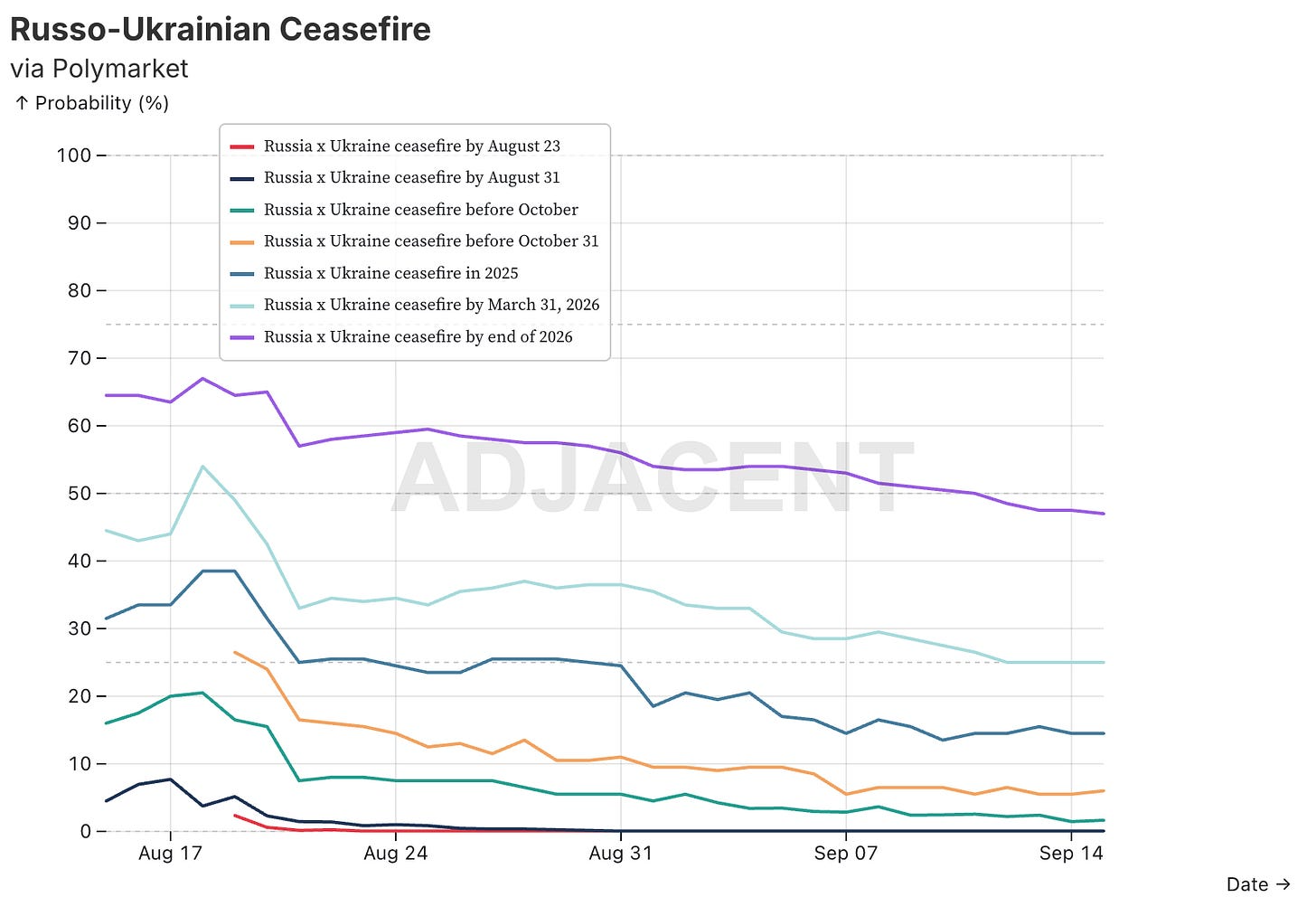 However Poland is not the only country that experienced Russian drones this week. Romania also scrambled its F-16 jets after Russian drone entered its airspace. No wonder ceasefire odds are trending down across the line.