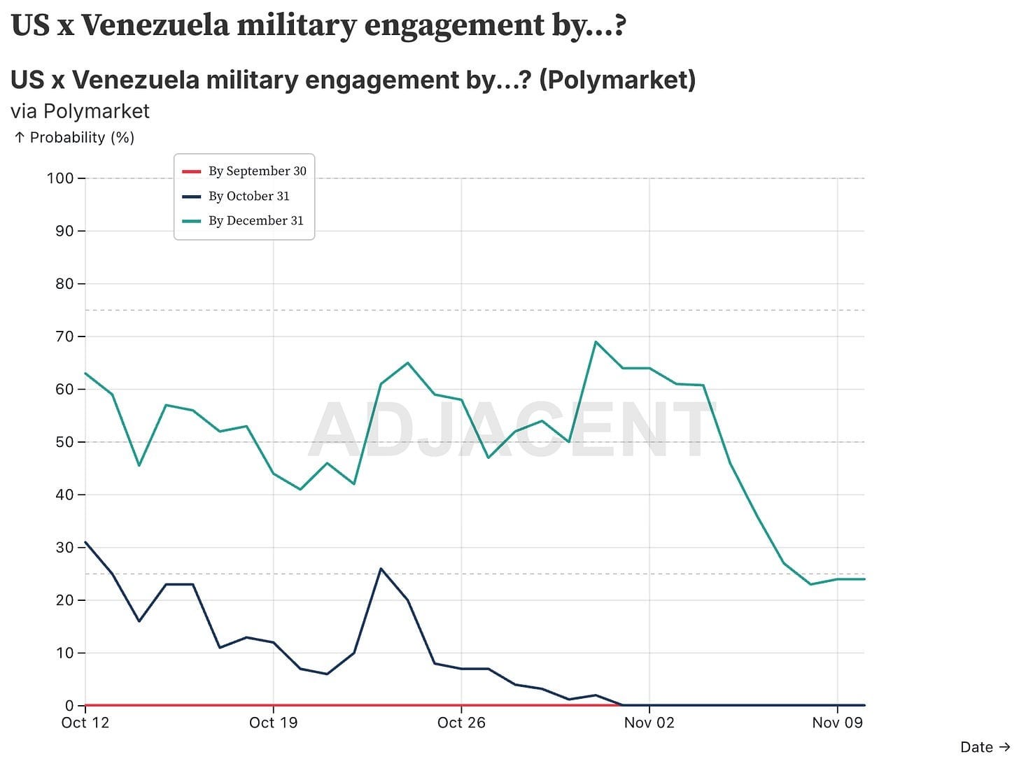 The IDF launched strikes in southern Lebanon as it ramps up pressure on Hezbollah to disarm. At the same time, each strike pushes Hezbollah closer to not disarming, citing a need to protect itself against ceasefire-breaking Israel. Markets for both a strike on Greater Beirut as well as Hezbollah strikes on Israel remain priced high: