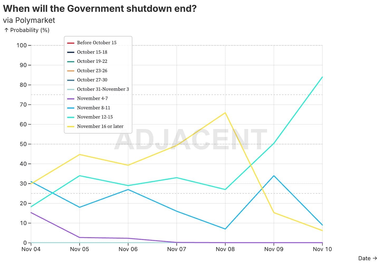 And this also ties very well with the shutdown drama. With food stamps only partially covered and increasing flight disruptions, it looks like there is some progress on a deal. Traders now expect the shutdown to end between 12th and 15th of November: