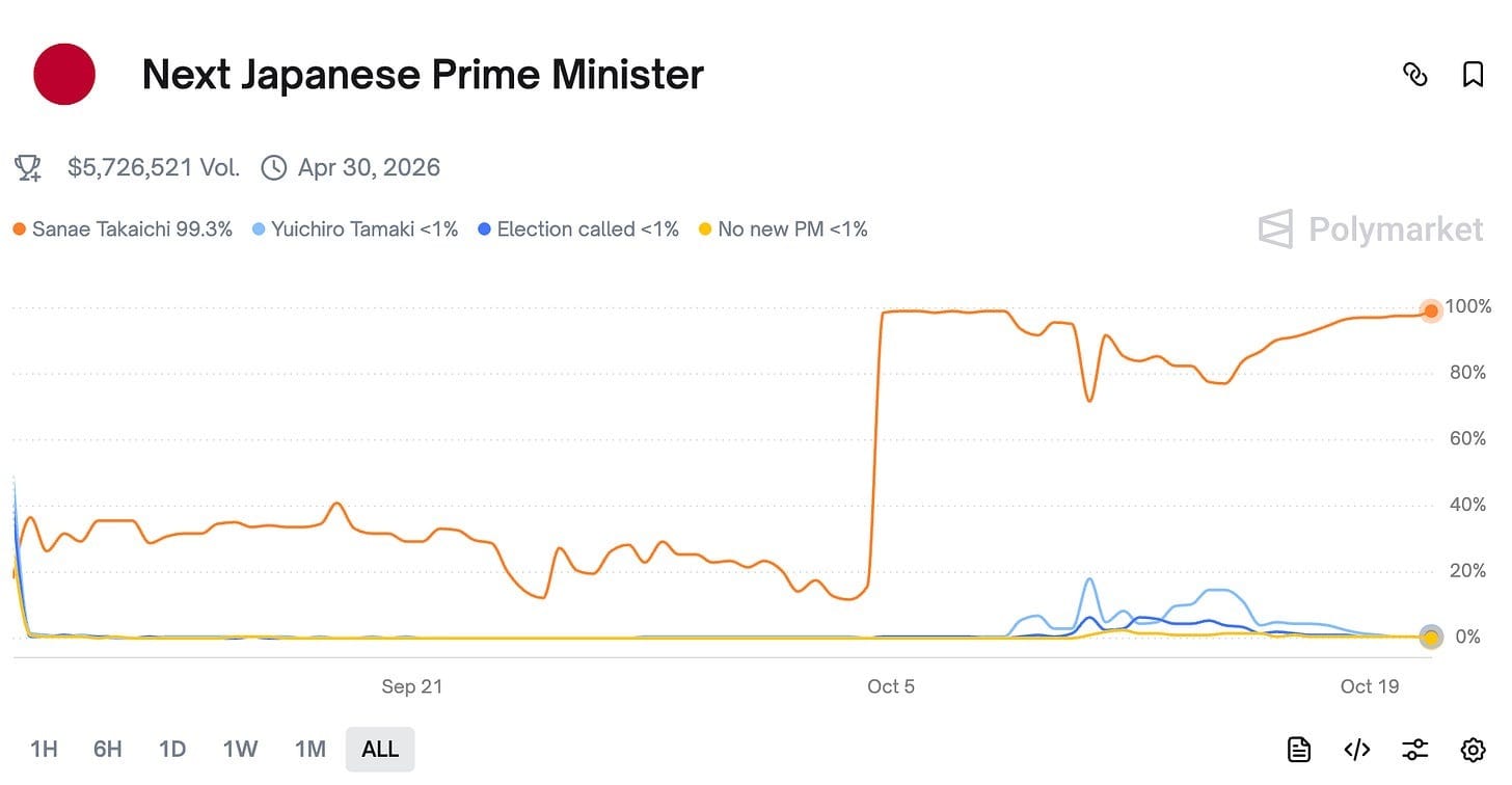 In Japan, Takaichi Sanae is once again looking safe to secure the PM spot. Last week there were some doubts as Komeito, a long standing coalition partner of LDP exited. However, now the center-right Japan Innovation Party will rule along LDP.