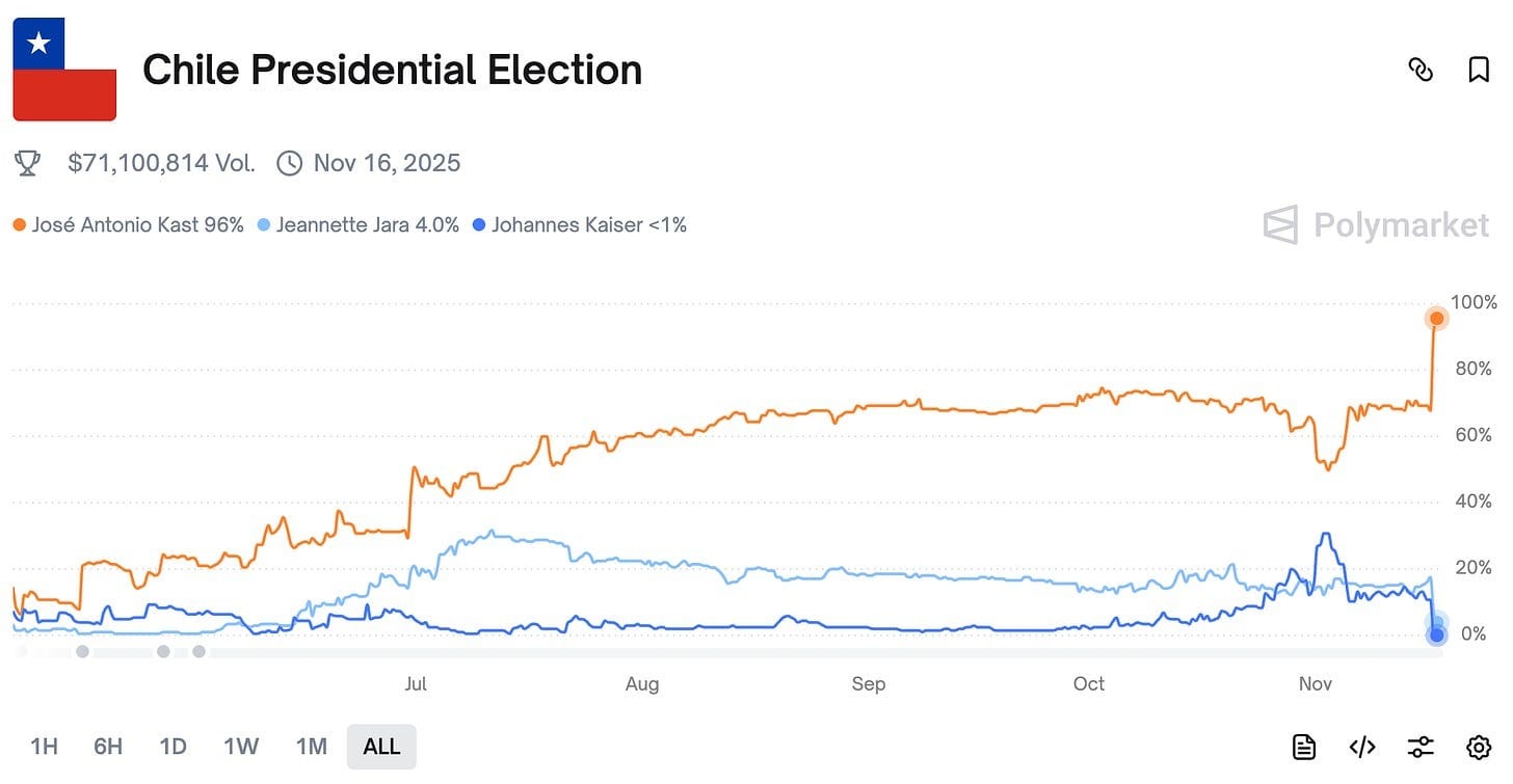 We had a first round presidential election in Chile, where as expected José Antonio Kast will face Jeannette Jara. Right wing Kast is expected to decisively win against his communist opponent: