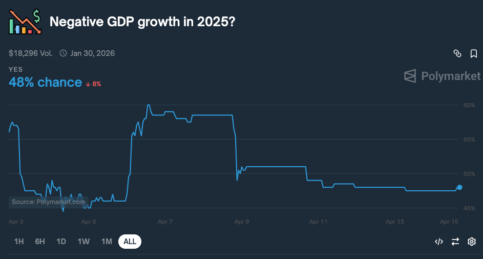 - Negative GDP growth in 2025? 48% chance (Polymarket)