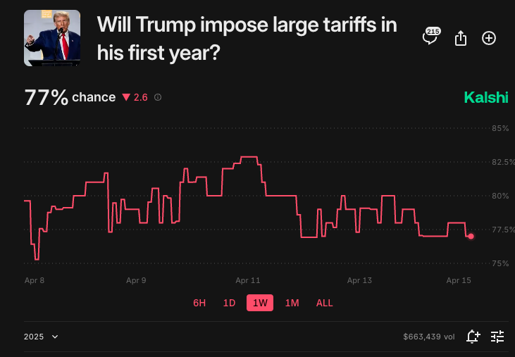 Trump’s Tariff Pause Shifts Trade Outlook: On April 9, 2025, Trump paused his tariff rollout for 90 days, followed by April 11 exemptions for high-value goods like chips and smartphones, retroactive to April 5. Polymarket’s “200% China tariff by June” odds fell to 15%, with volume at $35.7K, while Kalshi’s “Will Trump impose large tariffs in his first year?” dropped from 87% to 77% ($663K volume).