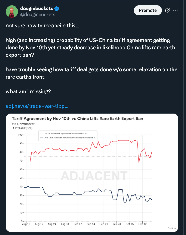 - Trade deal optimism surging - 70% chance of US-China tariff agreement by end of October, 94% by November 10th